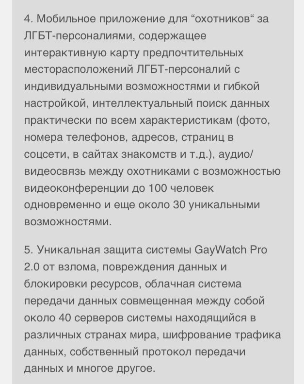 Не перечислили ни одной характеристики. Это рекламный текст ни о чём. А если уйти в историю немного дальше, за год до того они называли словом «GayWatch» слитую базу данных ЛГБТ-людей в Башкортостане. Фантазии про «мобильное приложение» и «40 серверов в различных странах мира» появились уже потом.