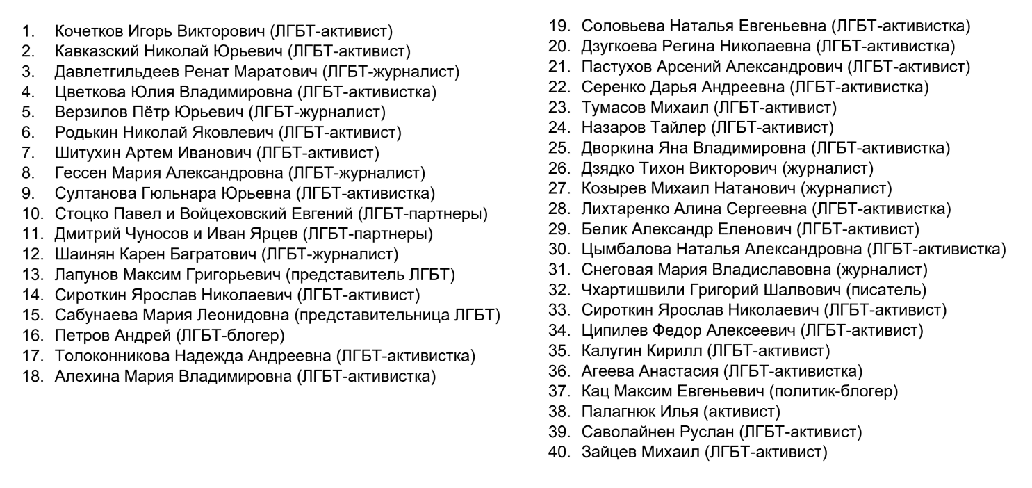 В новом письме сказано, что это «40+ человек, которые сбежали из России в Европу». К списку сразу много вопросов. С какой стати Верзилов ЛГБТ-журналист? С чего вдруг Серенко ЛГБТ-активистка? Почему Сабунаева вообще не активистка? Обещают найти нас в любой точке мира, но у двенадцати человек не смогли даже найти отчества. А Сироткина написали два раза. И вообще-то не все перечисленные находятся в Европе. Фу, какая халатность.