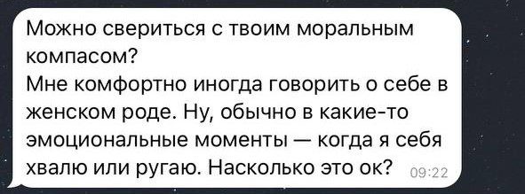 Очевидно, люди не относятся к гендеру нейтрально. Что-то из этого можно объяснить мизогинией и сексистскими стереотипами, но не всё и не всегда. А главное — в рамках этого текста не нужно ничего объяснять. Для меня важен сам факт: используемые гендерные окончания с гендерной идентичностью совпадают не всегда.