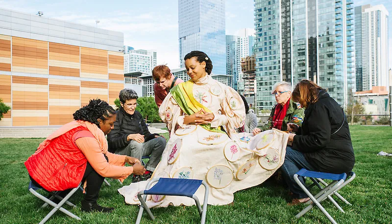 Квир*экология проявляется и в искусстве. Художни_цы и перформер_ки работают с телом, природой и идентичностью как с взаимосвязанными темами. Например, Лиз Харви создала серию перформансов Lost Ones. В них она через тело исследует опыт нечеловеческого мира, использует вышивку и совместное шитьё, чтобы создать одежду, которая символизирующую исчезающие растения.