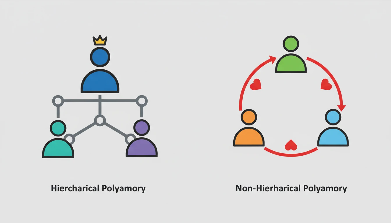 В неиерархической модели все партнёры равны. Не в смысле, что всем достаётся поровну времени (попробуйте разделить неделю на троих — математика против вас). А в том, что никто не имеет власти над другими отношениями. Никто не «главнее». Решения принимаются вместе, но каждый сохраняет автономию.