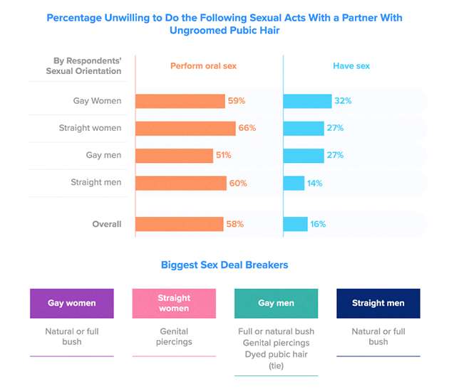 Немногим более половины геев (51%) и 59% лесбиянок не будут заниматься оральным сексом, если у партнёра неухоженные лобковые волосы. Неопрятный вид в этой области также является барьером для проникающего секса почти для трети лесбиянок и 27% геев.
