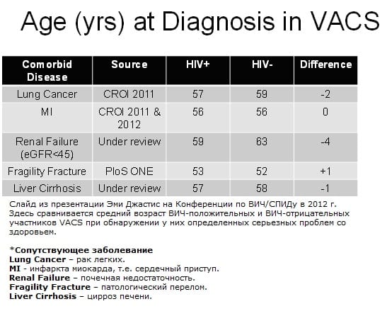 Слайд из презентации Эми Джастис на Конференции по ВИЧ/СПИДу в 2012 г. (Щелкните, чтобы увеличить изображение). Здесь сравнивается средний возраст ВИЧ-положительных и ВИЧ-отрицательных участников VACS при обнаружении у них определенных серьезных проблем со здоровьем.