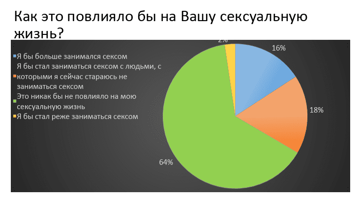 Больше половины тех, кто готов принимать доконтактную профилактику ВИЧ, (64%) признаются, что это вряд ли бы повлияло на их сексуальную жизнь. При этом 18% стали бы заниматься сексом с теми, с кем стараются не делать это сейчас, в 12% стали бы заниматься сексом чаще в принципе.