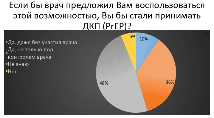 Осведомленность участников опроса о том, что же такое PrEP, оказалось не очень высокой – лишь 37% из них прежде что-то слышали о PrEP. При этом лишь 6% ответили, что откажутся принимать эти препараты, даже если им их посоветует врач. Под присмотром специалиста согласятся пить такие таблетки 36%, а 10% готовы делать это и самостоятельно. Почти половина участников опроса (48%) в настоящий момент не могут ответить, согласились бы они принимать PrEP или нет.