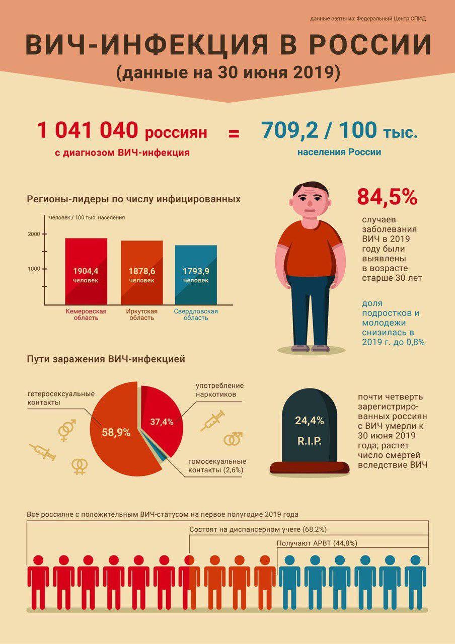 В 2019 году количество ВИЧ-положительных россиян перевалило за отметку в 1 млн человек. Как сейчас обстоит ситуация в России — в этой инфографике.