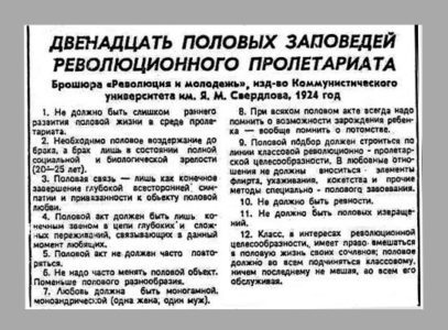 В брошюре 1924 года «Двенадцать половых заповедей революционного пролетариата» сказано: «Не должно быть половых извращений». «Класс, в интересах революционной целесообразности, имеет право вмешаться в половую жизнь своих сочленов. Половое должно во всём подчиняться классовому, ничем последнему не мешая, во всём его обслуживая».