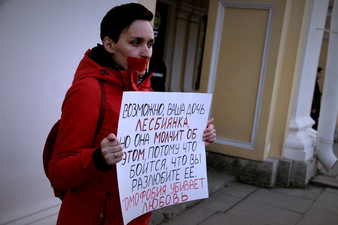 Сегодня, 17 сентября, участники петербургской акции собрались у Гостиничного двора к 18:45. Чтобы не нарушать закон о митингах, акция проходила в формате серии одиночных пикетов: ЛГБТ-активисты по очереди доставали плакаты и становились с ними неподалеку от выхода из метро.
