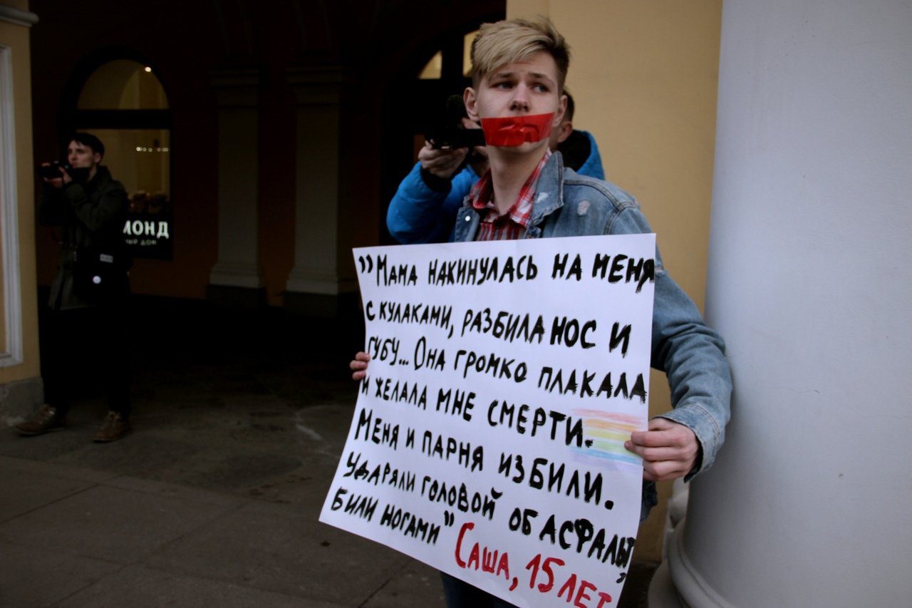 Все продолжалось относительно спокойно до появления в руках участника акции Даниила плаката с цитатой 15-летнего подростка Саши из Северного Кавказа, пострадавшего от гомофобии: «Мама накинулась на меня с кулаками, разбила нос и губу… Она громко плакала и желала мне смерти. Меня и парня избили. Ударяли головой об асфальт и били ногами» (эти слова взяты из публикации «Радио Свобода».