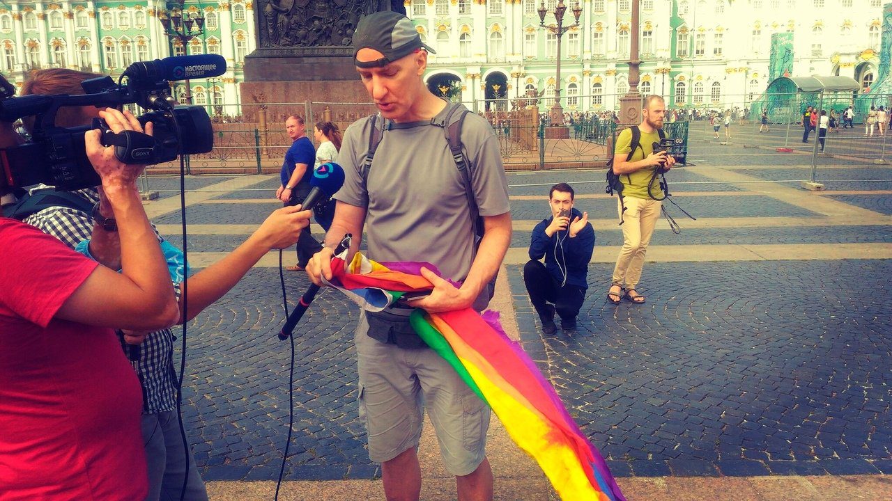 Вчерашняя ЛГБТ-акция в Петербурге была, пожалуй, одной из самых необычных за все последние годы. Полдень субботы. На Дворцовой площади проходит фестиваль байкеров. Несколько сотен мотоциклов и их владельцев расположились по ее периметру. Мало кто из них замечает, что в 12:35 у Александровской колонны появляется большой радужный флаг и начинается петербургский ЛГБТ-прайд, который благодаря старанию администрации города в этом году проходил в форме одиночных пикетов.