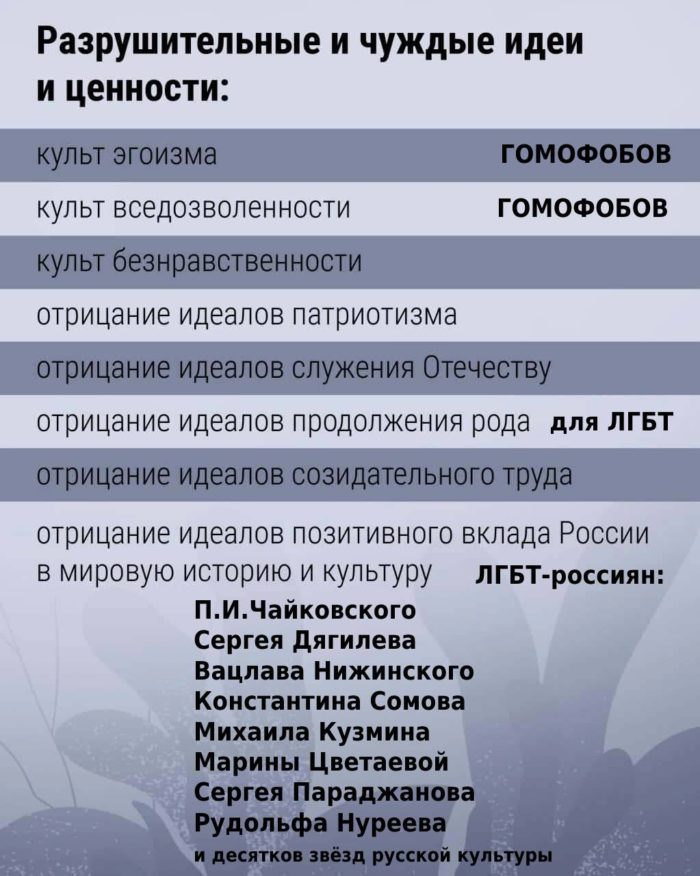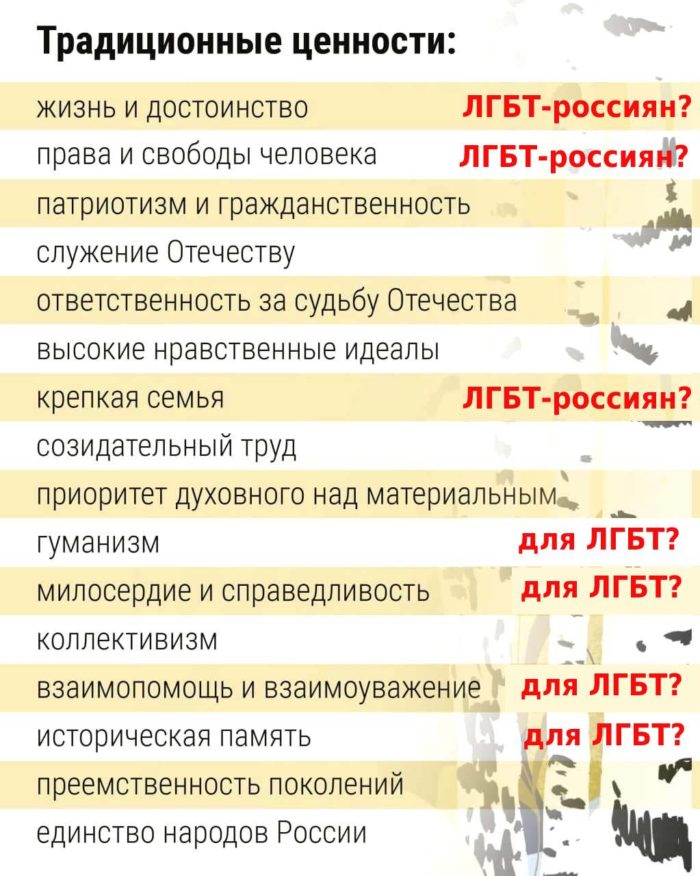Если заглянуть в список традиционных ценностей, предложенный российским официозом, то у миллионов ЛГБТ-россиян могут возникнуть вопросы.