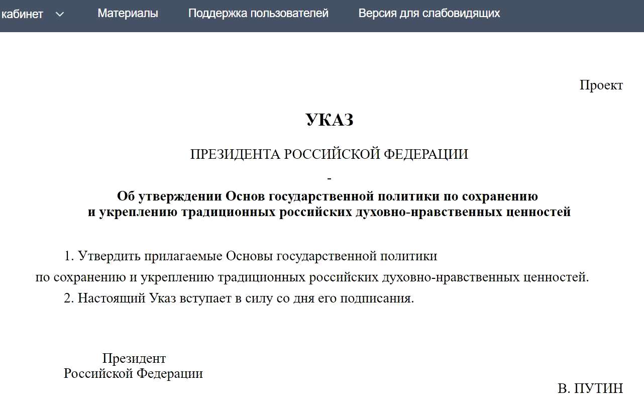 Завершилось общественное обсуждение проекта Указа президента РФ Владимира Путина под названием «Основы государственной политики по сохранению и укреплению традиционных российских духовно-нравственных ценностей».