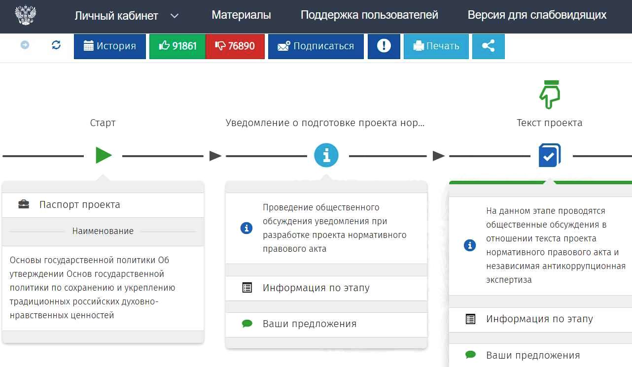 На портале нормативных актов за проект указа проголосовало 91 861 человек; против — 76 890. (Не каждый проект документа собирает такое количество противников).