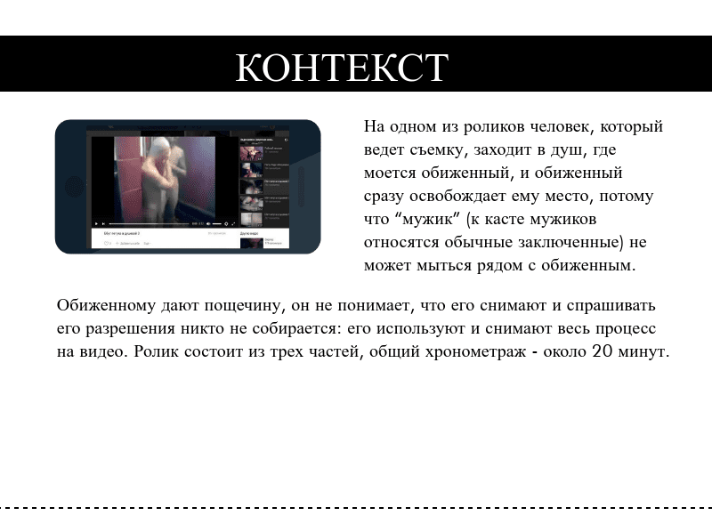 Но «на зоне», если ты находишься на дне тюремной иерархии, в категории «обиженных» (куда, как правило, автоматически попадают открытые геи, бисексуалы, трансгендерные люди), то у тебя практически нет выбора. Принуждение к сексу — здесь не уголовное преступление, а обычное дело, каждодневная реальность. Мы видим в тюремных порнороликах, что человек в принимающей роли — почти всегда воспринимается как объект, а не как субъект отношений.