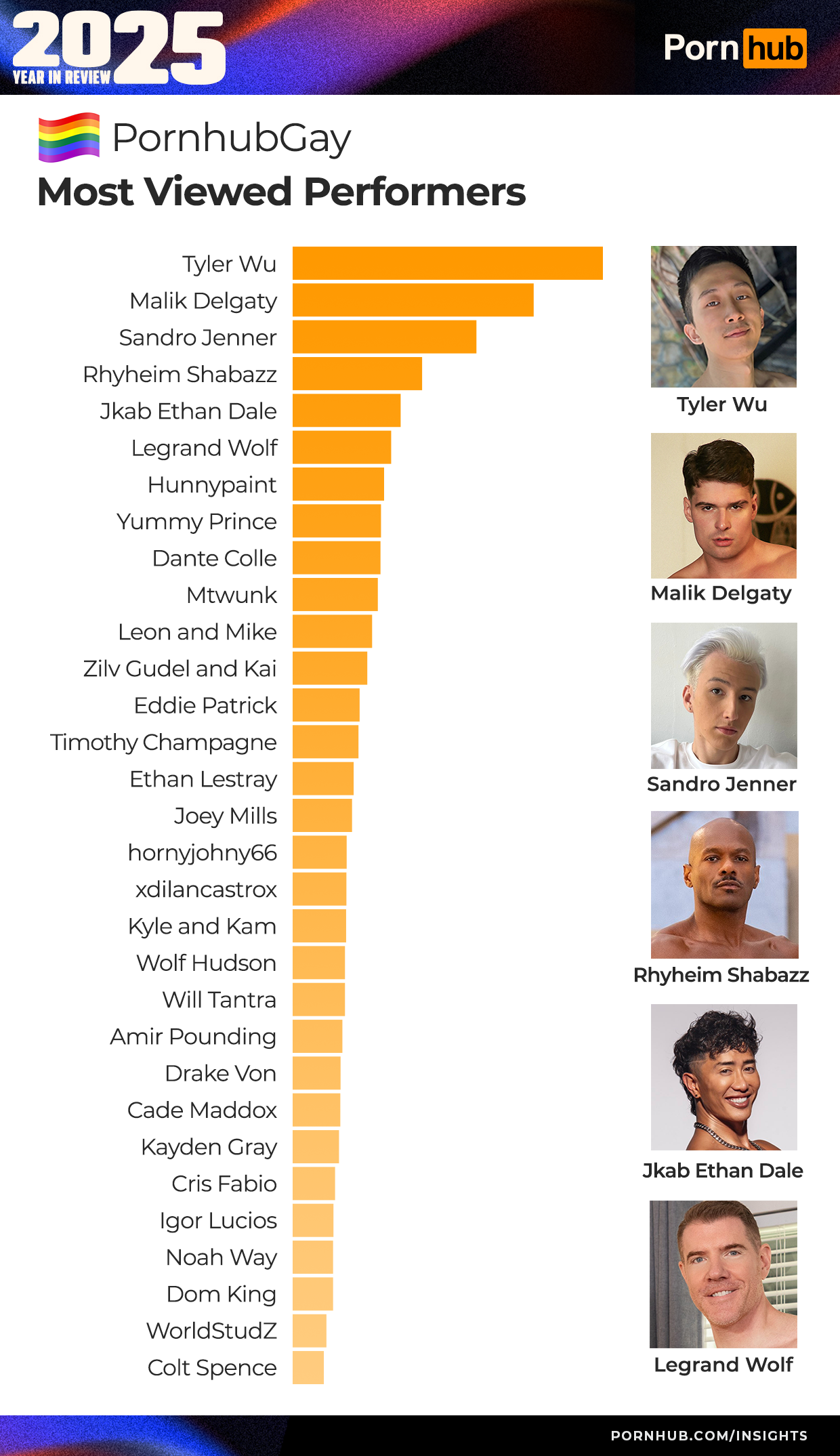 В 2025 году в топе самых просматриваемых гей-актёров случилась небольшая, но заметная рокировка: Тайлер Ву занял 1-е место, а прошлогодний лидер Малик Делгати опустился на 2-ю строчку. Тайлер — бывший фигурист и артист тематических парков, который, как он сам рассказывает, наконец-то наслаждается тем, что позволяет миру видеть его сексуальную сторону. У него есть собственный сайт, на котором он продаёт свои «горячие видео».