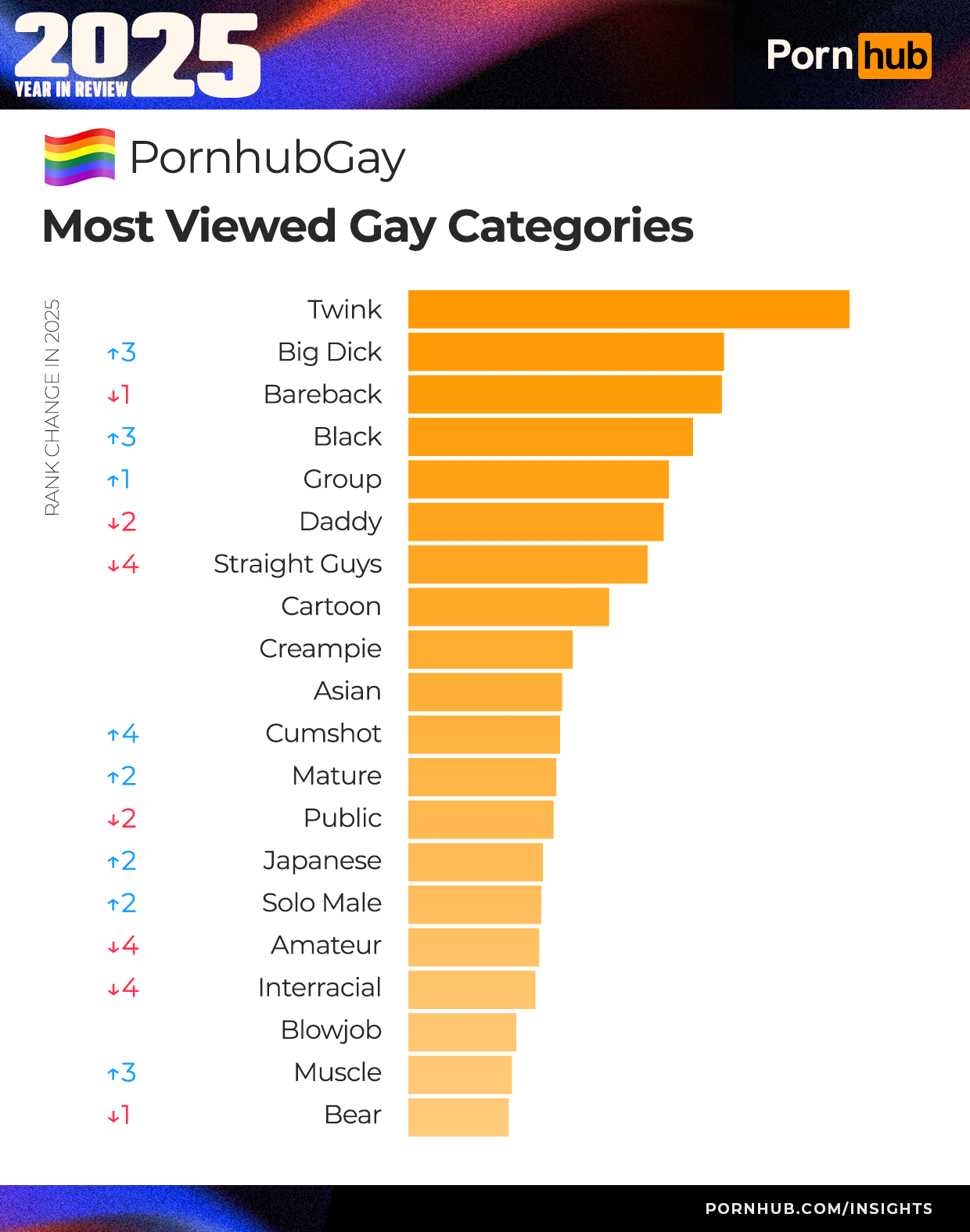Если говорить о просмотрах категорий, то в гейской части Pornhub обычно не бывает резких изменений — и 2025 год это подтверждает. Категория «twink» вновь оказалась на первом месте. А вот дальше уже интереснее — категория «Big Dick» (большой член) поднялась сразу на три позиции и заняла 2-е место, сдвинув «Bareback» (секс без презерватива) на 3-ю строчку.