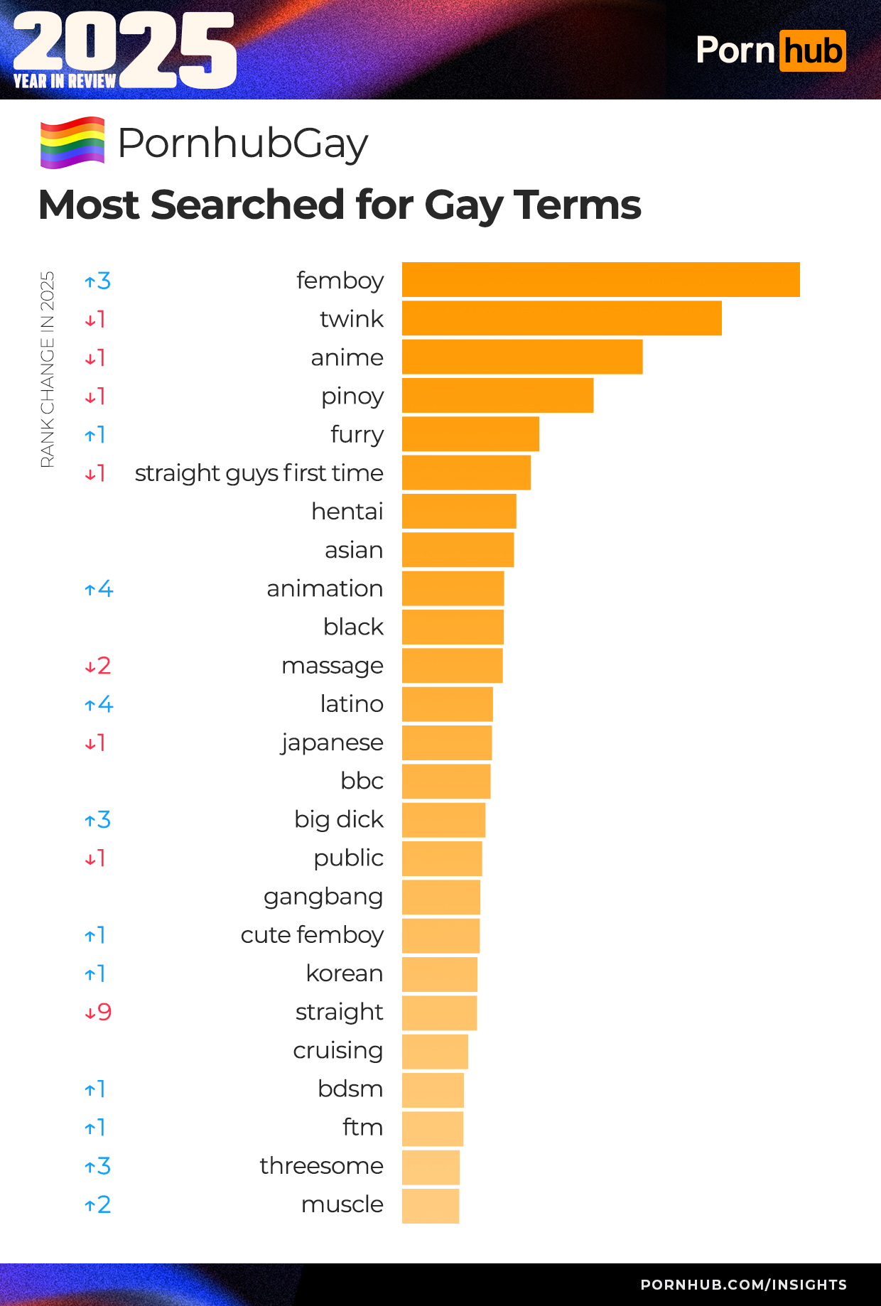 Самое заметное падение среди запросов в 2025-м — у натуралов. Запрос «straight» рухнул на –9 позиций. Команда Pornhub предполагает, что это может быть связано с общим ростом интереса к более феминным мужчинам.