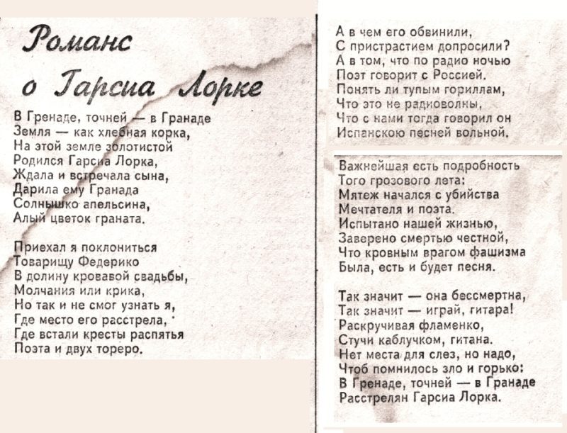 В октябре 1980 года поэт Евгений Долматовский опубликовал в “Литературной газете” поэтический отчёт на целую страницу – о поездке в Испанию. Был там и “Романс о Гарсиа Лорке”.