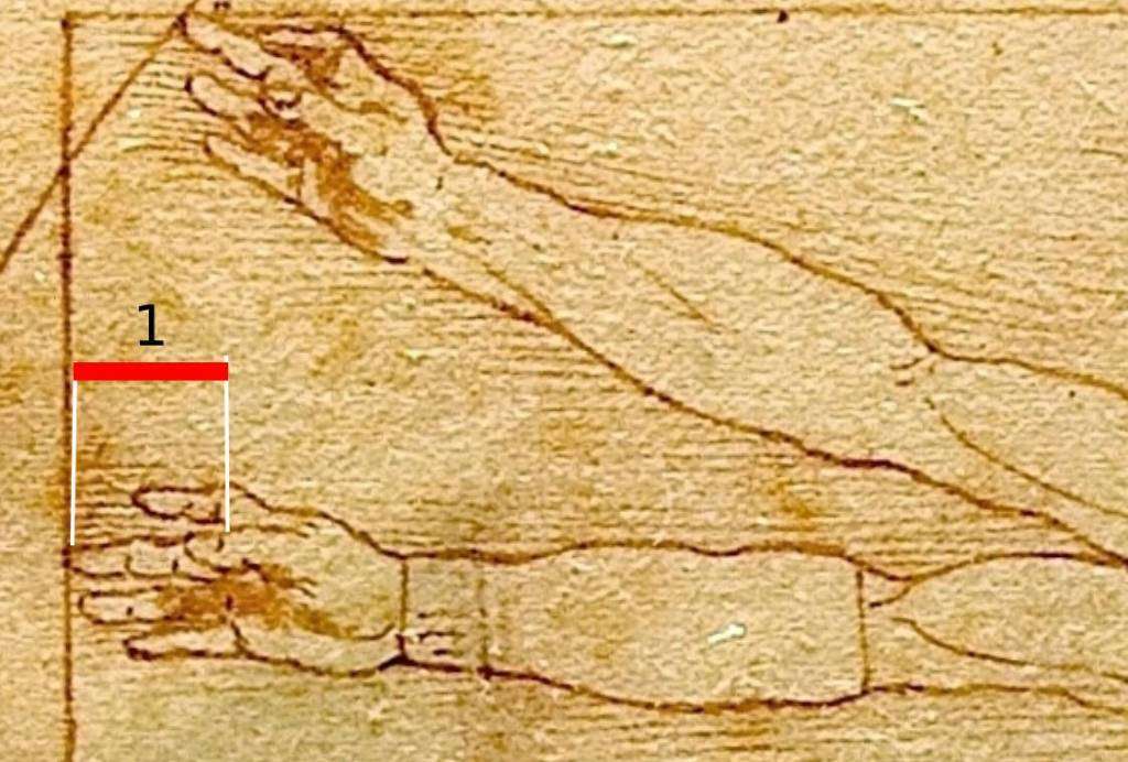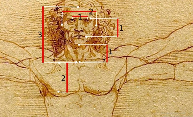 Единственная связь с подсчётами Витрувия – это равенство роста с размахом рук (знаменитый квадрат). В остальном Леонардо, скорее всего, шёл от своих наблюдений, изучая средние пропорции в мужском «геометрическом» портрете.