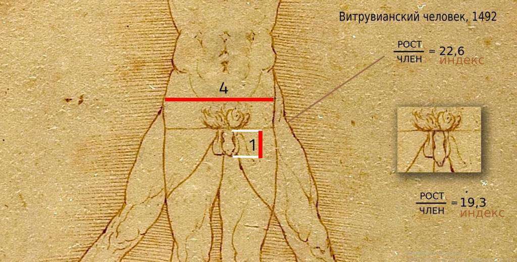 В реальности отношение роста к длине пениса будет другим, чем на картинке Леонардо. Например, 173 см : 9 см = 19,2 (у Леонардо = 22,6). В переводе на проценты, длина члена европейца составляет 5,2% от его роста (у Леонардо 4,4%).