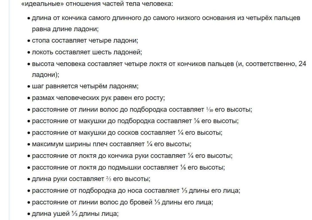 Так, давно известны примеры гармоничной геометрии: длина ушей равна 1/3 лица, а стопа составляет 4 ладони (полный список ниже).
