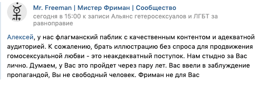 После, в комментарии под постом Алексея сообщество заявило, что ЛГБТ-активист стал жертвой пропаганды и, скорее всего, одумается. Вердикт был прост: «Фриман не для Вас».