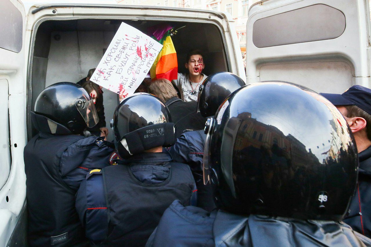 Пролежали мы секунд 15. Полицейские быстро и грубо запихали нас в небольшой автозак. Там едва поместились 11 человек. Все ЛГБТ-активисты и пожилой мужчина, который шел с табличкой «Путин – вор!», его задержали чуть раньше.