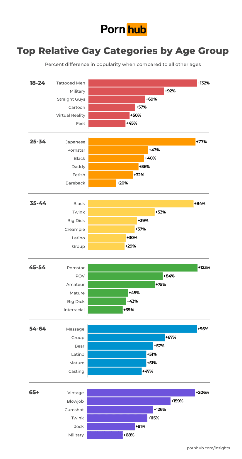 У самой возрастной группы — 65+ — в топе ретро-порно (+206%), оральный секс, cumshot (окончание на тело, обычно на лицо), «твинки», спортсмены и, как мы говорили в начале, военные.