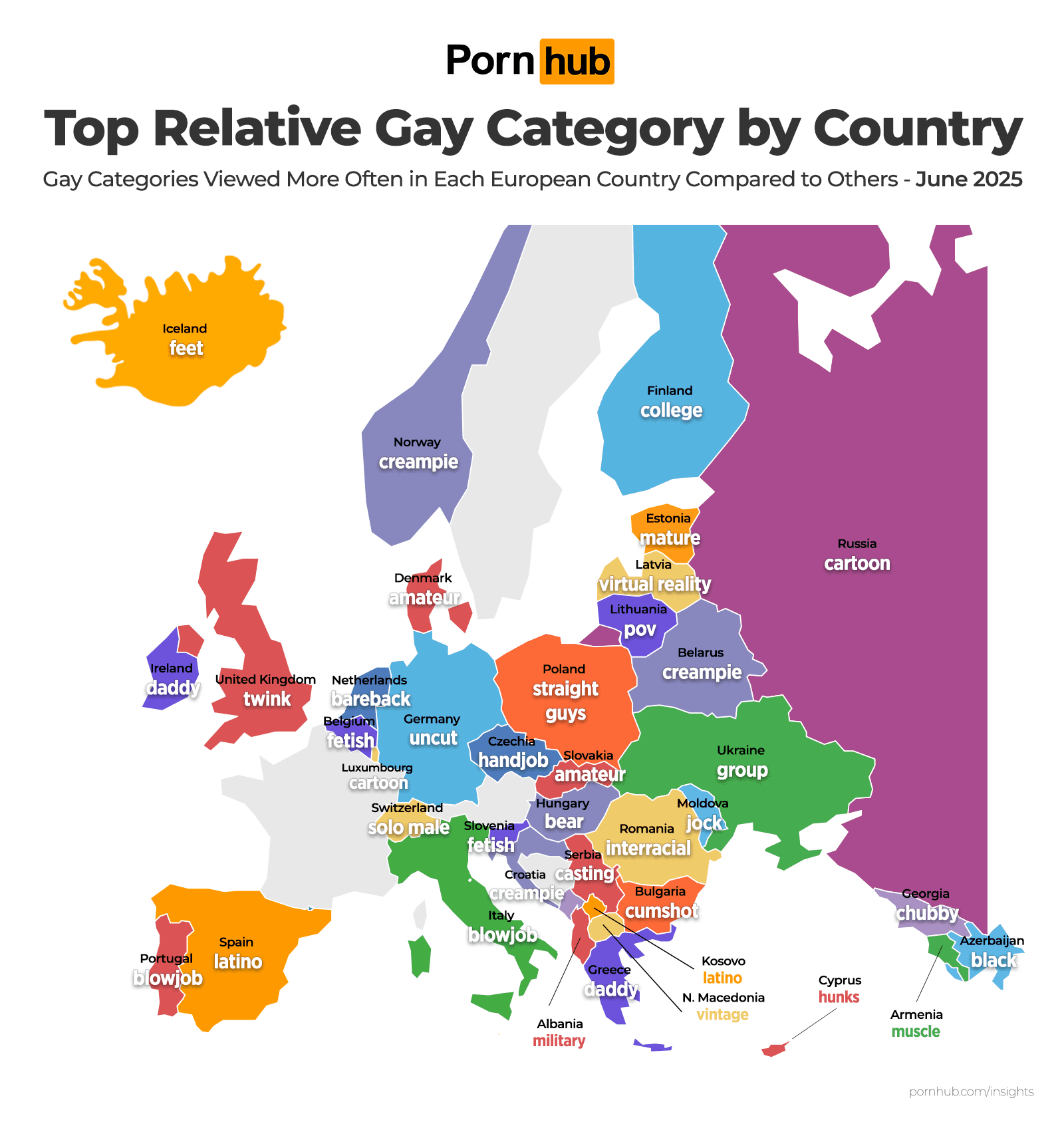 В Исландии особенно любят контент со ступнями (Feet). В Чехии — «работу руками» (дрочка). В Украине чаще других выбирают групповой секс, а вот в Швейцарии — наоборот, предпочитают соло-видео с мужчинами. Поляки чаще искали «натуралов», а ирландцы — «папочек». В Германии на первом месте — «необрезанные» (Uncut), а в Италии предпочитают видеоролики с оральным сексом.