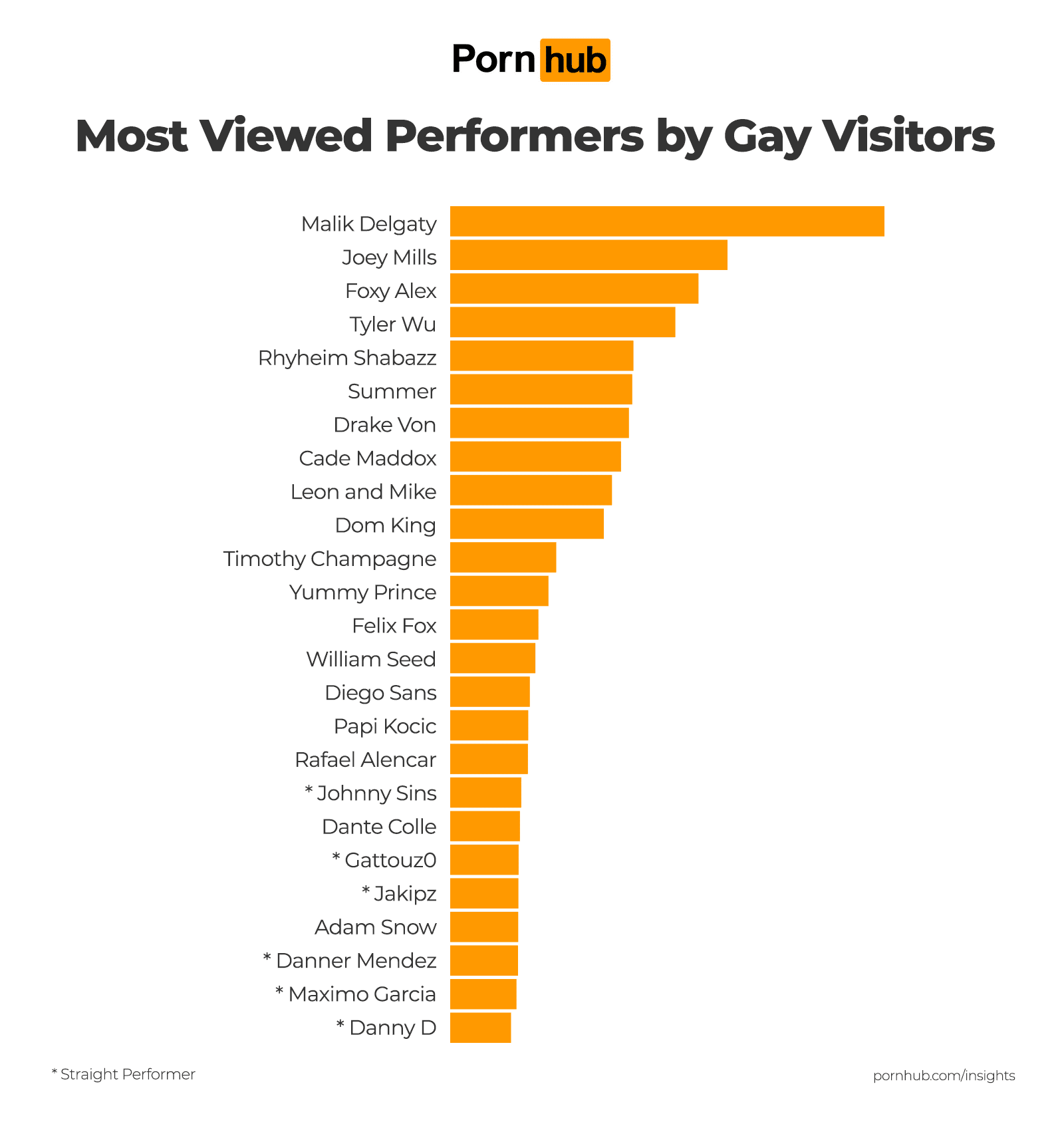 Интересно, что в топ-25 теперь зачастую оказываются натуралы, которые просто снимаются в гей-контенте. В списке ниже их отметили звездочкой (хотя Малика отмечать не стали — а ведь он заявлял, что идентифицирует себя как гетеросексуал, а с мужчинами занимается сексом на камеру, потому что не гомофоб!):