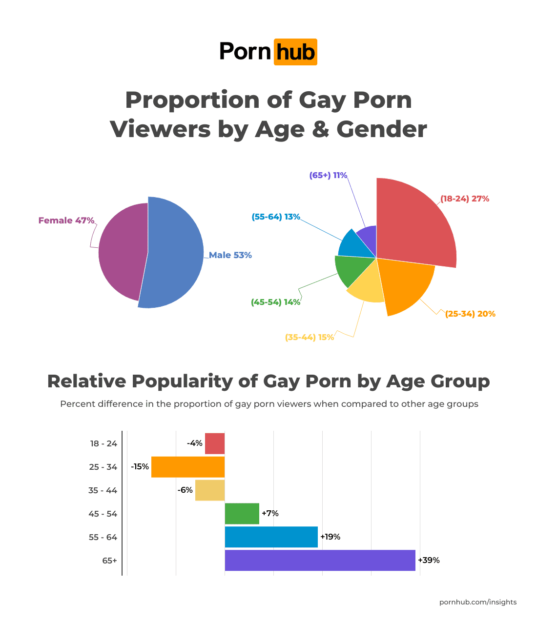 Но если сравнивать, насколько часто разные возрастные группы выбирают гей-контент, то тут лидируют именно 65+. Они делают это на 39% чаще, чем в среднем по другим возрастам. А вот молодёжь 18–24 года, наоборот, на 4% реже. Получается, чем старше зритель — тем выше его интерес к гей-порно.