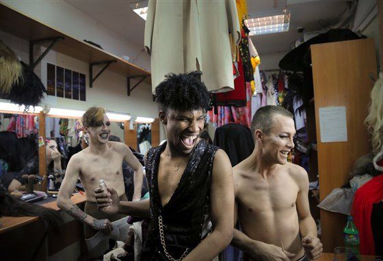 Андре Стар втискивается в сверкающее желтое платье, ее запястья украшены нитками жемчуга. Африка натягивает огненно-рыжий парик и тихонько курит. Один из артистов перед выходом на сцену сидит в телефоне. Двое других — обмениваются перед выступлением поцелуями, лишь слегка касаясь друг друга, чтобы не смазать безупречно нанесенную помаду.