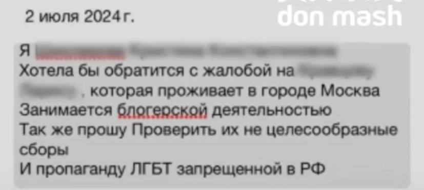 Изучив инстаграм Кристины внимательнее, они обнаружили «непристойные публикации в виде уделения внимания людям одинакового пола». По словам Мишина, после этого они «были вынуждены обратиться в полицию». На скриншоте заявления видно, что Шихлерова просит «проверить не целесообразные сборы и пропаганду ЛГБТ»: