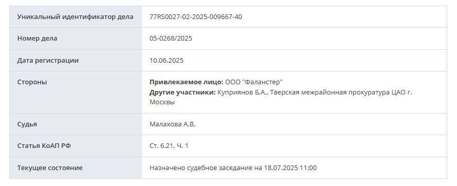 В Тверской районный суд Москвы поступил протокол о «ЛГБТ-пропаганде» на книжный магазин «Фаланстер». Судебное заседание назначено на 18 июля.