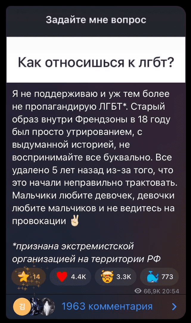 «Я не поддерживаю и уж тем более не пропагандирую ЛГБТ*. Старый образ внутри Френдзоны в 18 году был просто утрированием, с выдуманной историей, не воспринимайте все буквально. Все удалено 5 лет назад из-за того, что это начали неправильно трактовать. Мальчики любите девочек, девочки любите мальчиков и не ведитесь на провокации ✌🏻», — написала в своем канале певица.