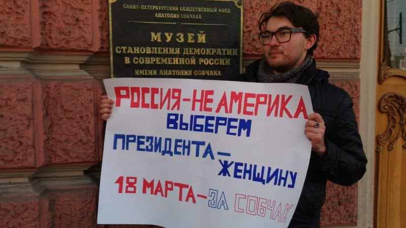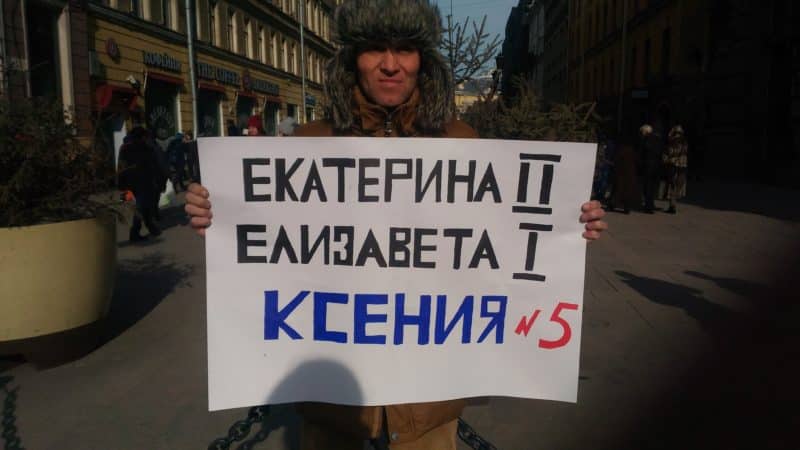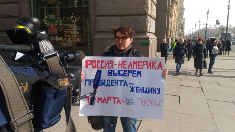 В Международный женский день, 8 марта, несколько неравнодушных петербуржцев вышли на Невский проспект с одиночными пикетами в поддержку кандидатуры Ксении Собчак на пост президента РФ и против сексизма в российской политике.