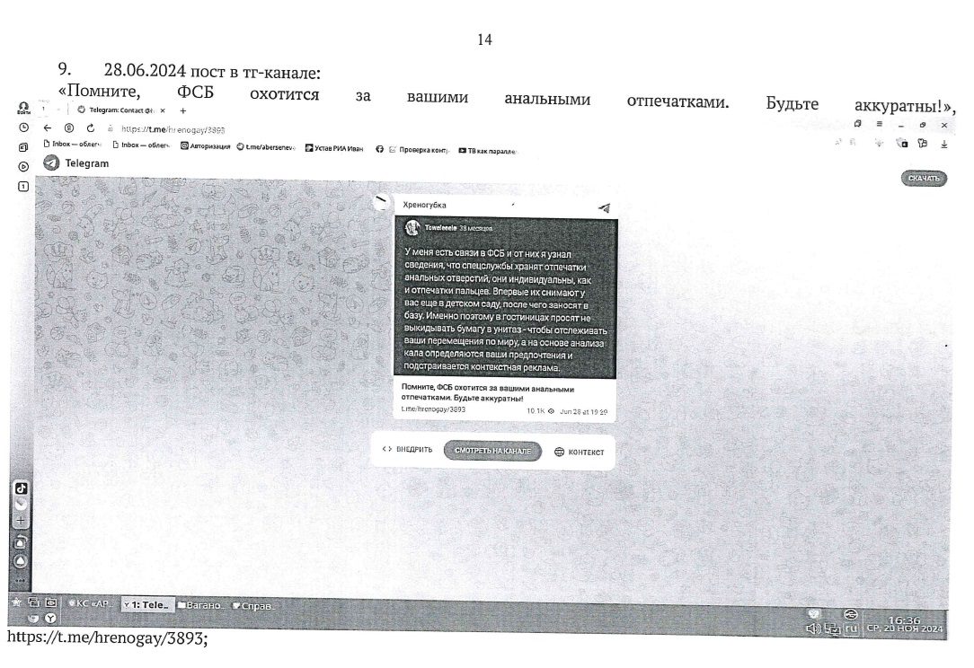 Не особо удивлён этому. Хотя предоставленная справка меня повеселила. Я теперь долго буду рассказывать всем про то, что шуточный пост со словами «ФСБ охотится за вашими анальными отпечатками» является «публикацией, попадающей под политическую деятельность».