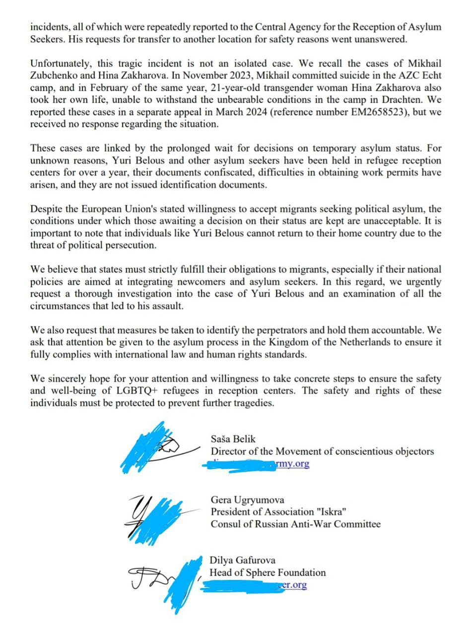 Ранее, в апреле, фонд «Сфера» и «Движение сознательных отказчиков» также обратились в Минюст Нидерландов с требованием провести расследование случаев самоубийств среди просител:ьниц убежища. Также исследовательни:цы из ЛГБТ+ организации COC Nederland отмечали, что местное миграционное законодательство ставит под угрозу многих людей, бежавших из стран, где ЛГБТ+ подвергаются преследованиям.