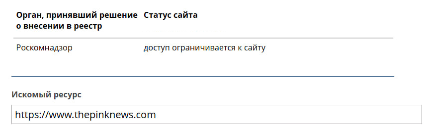 Сайт ЛГБТК-медиа PinkNews внесли в единый реестр запрещённых ресурсов. Это обнаружила команда Парни+ на сайте Роскомнадзора: там указано, что доступ к thepinknews.com в настоящее время ограничивается.