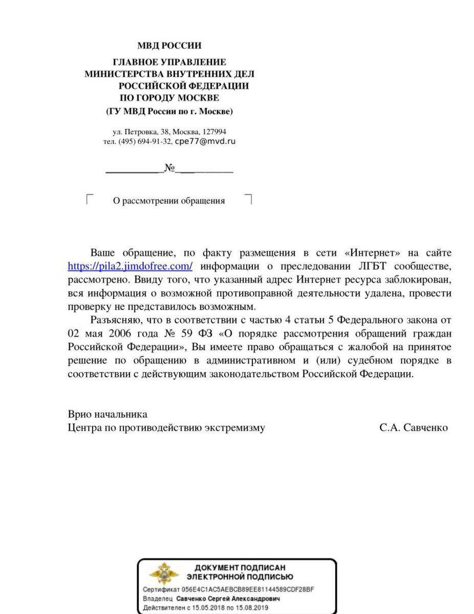 В официальном ответе поясняется, что обращение рассмотрено, но «ввиду того, что указанный адрес интернет-ресурса заблокирован, вся информация о возможной противоправной деятельности удалена, провести проверку не представилось возможным. Ответ подписан временно исполняющим обязанности начальника Центра по противодействию экстремизма С. Савченко.