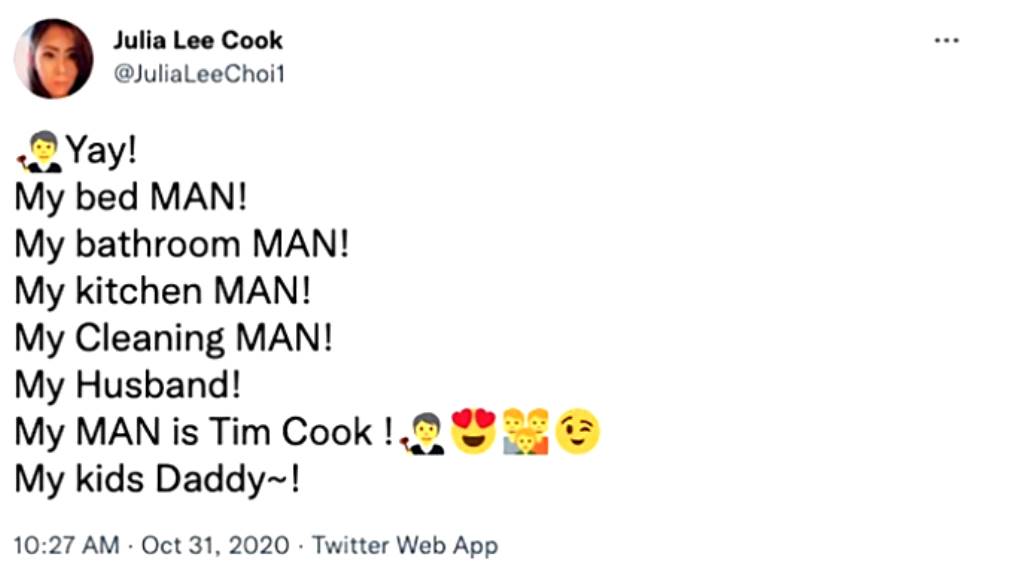 В социальных сетях Чой называет себя Джулией Ли Кук, утверждая, что глава Apple — её муж и «отец детей-близнецов». (Позже она заявила, что «близнецы умерли»).