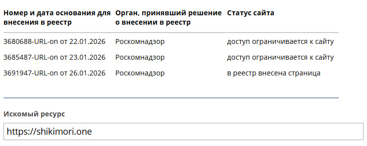 Роскомнадзор ограничил доступ к аниме-сайту Shikimori и внес ресурс в реестр сайтов с «запрещенной для распространения в РФ информацией».