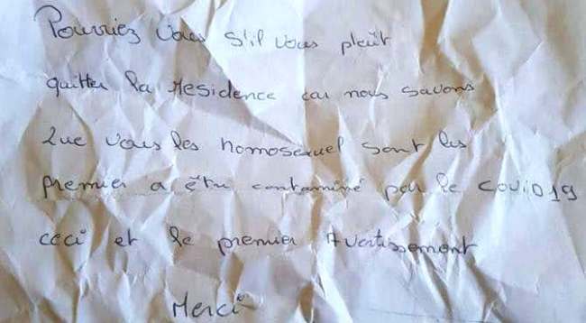 «Не могли бы вы покинуть место жительства, поскольку мы знаем, что вы, гомосексуалисты, в первую очередь заражаетесь COVID-19 . Это первое предупреждение», — гласило послание.