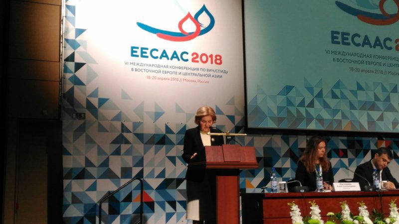 Сегодня, 18 апреля, на церемонии открытия EECAAC-2018 (VI Международной конференции по ВИЧ/СПИДу в Восточной Европе и Центральной Азии) ВИЧ-активисты из разных городов России провели небольшую акцию против перебоев выдачи антиретровирусной терапии. Люди в белых футболках с нарисованными красными буквами выстроились в линию, образовав надпись «СТОП ПЕРЕБОИ».