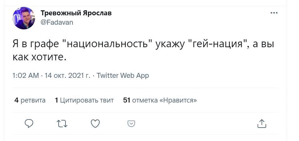 ЛГБТ-активист Ярослав написал в Телеграме: «Тут перепись населения намечается. И за пару недель до этого началась кампания про то, чтобы указать миноритарные национальности, чтобы не терялось финансирование родных языков и прочая. Ну и для видимости (…). Я никогда себя с национальностью не ассоциировал, хотя иногда обозначал себя как бурята (по корням деда), но тут свой выбор сделал. Я в графе «национальность» укажу «гей-нация», а вы как хотите».