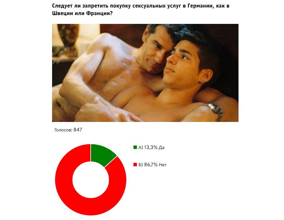 Популярный немецкий ЛГБТ-сайт Queer.de в сентябре провёл опрос среди своих читателей: надо ли запретить в Германии покупку секс-услуг, как во Франции и Швеции? Из 847 человек “за” проголосовали 13,3 % , “против” — 86,7%