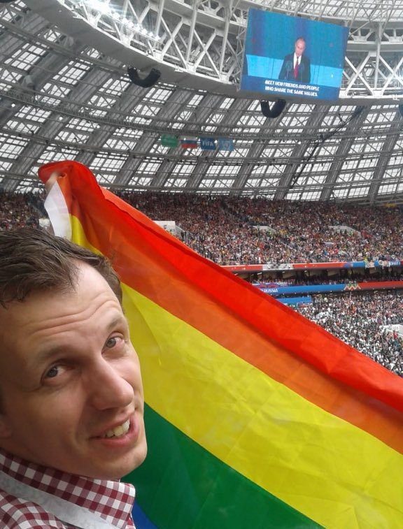 - Другое важное событие произошло 14 июня, когда впервые на российском футбольном стадионе футбольный болельщик смог поддержать свою команду радужным флагом. Этим болельщиком был я. Кому-то ситуация может показаться абсурдной – мол, команду поддерживают или символикой футбольного клуба, или национальным флагом. Но тем, кто знает историю ЛГБТ+ движения среди футбольных болельщиков, существующую проблему гомофобии в России вообще и в футболе в частности, им будет ясна вся важность этого жеста. И я рад, что фортуна была на нашей стороне: я поднимал радужный флаг каждый раз, когда российская сборная забивала гол в ворота саудовской команды. А сделали это наши ребята целых пять раз. Геи есть и среди болельщиков, и среди судей, и среди футболистов. Это факт. Аксиома. Так же как и то, что футбол должен нести позитивное, объединяющее людей послание, быть свободным от любых форм дискриминации. Идёт ли речь о гомофобии, сексизме или расизме – этому не должно быть места в футболе.